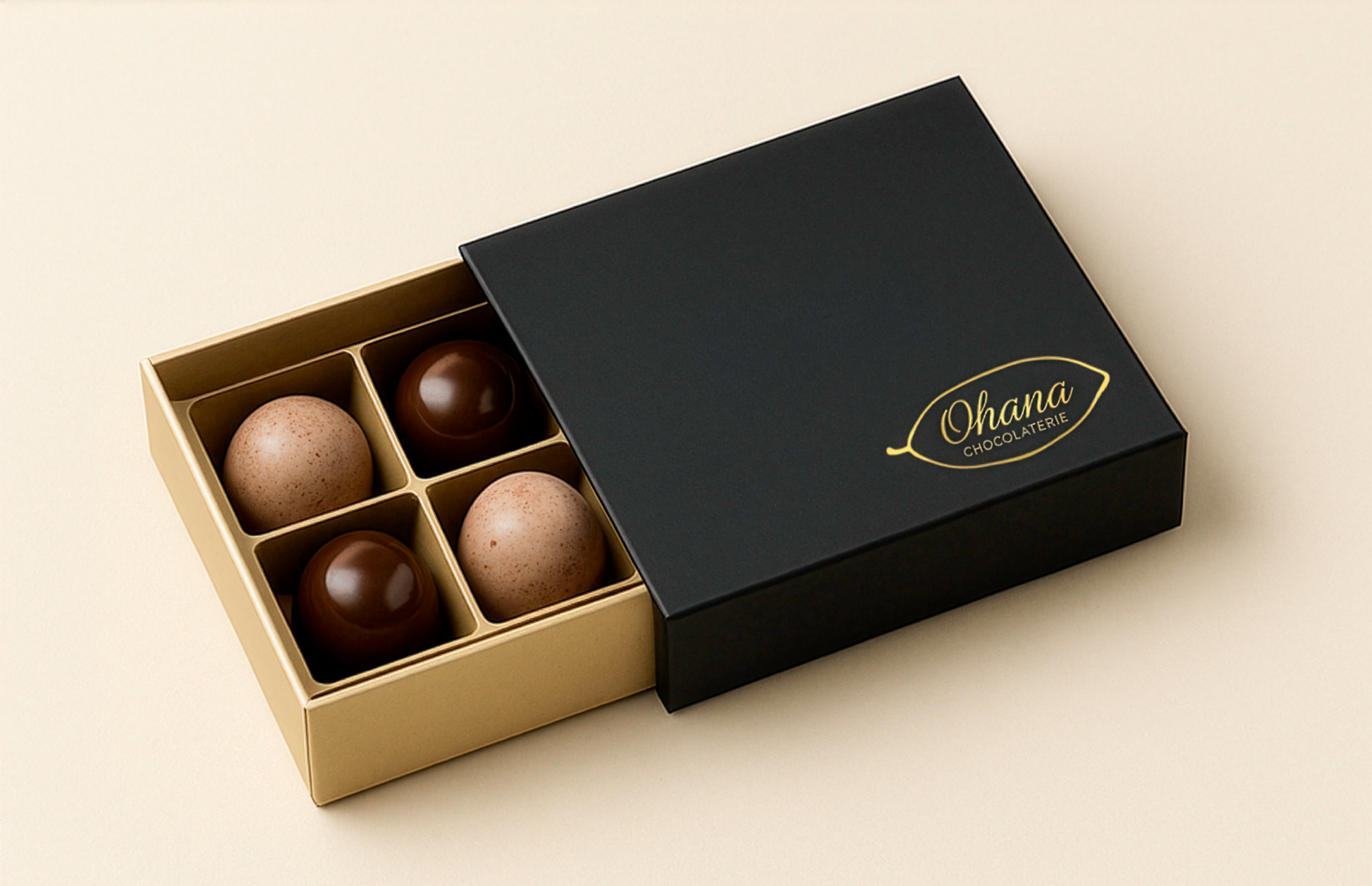 Seis bombons artesanais Ohana, feitos com chocolate belga Callebaut 70%